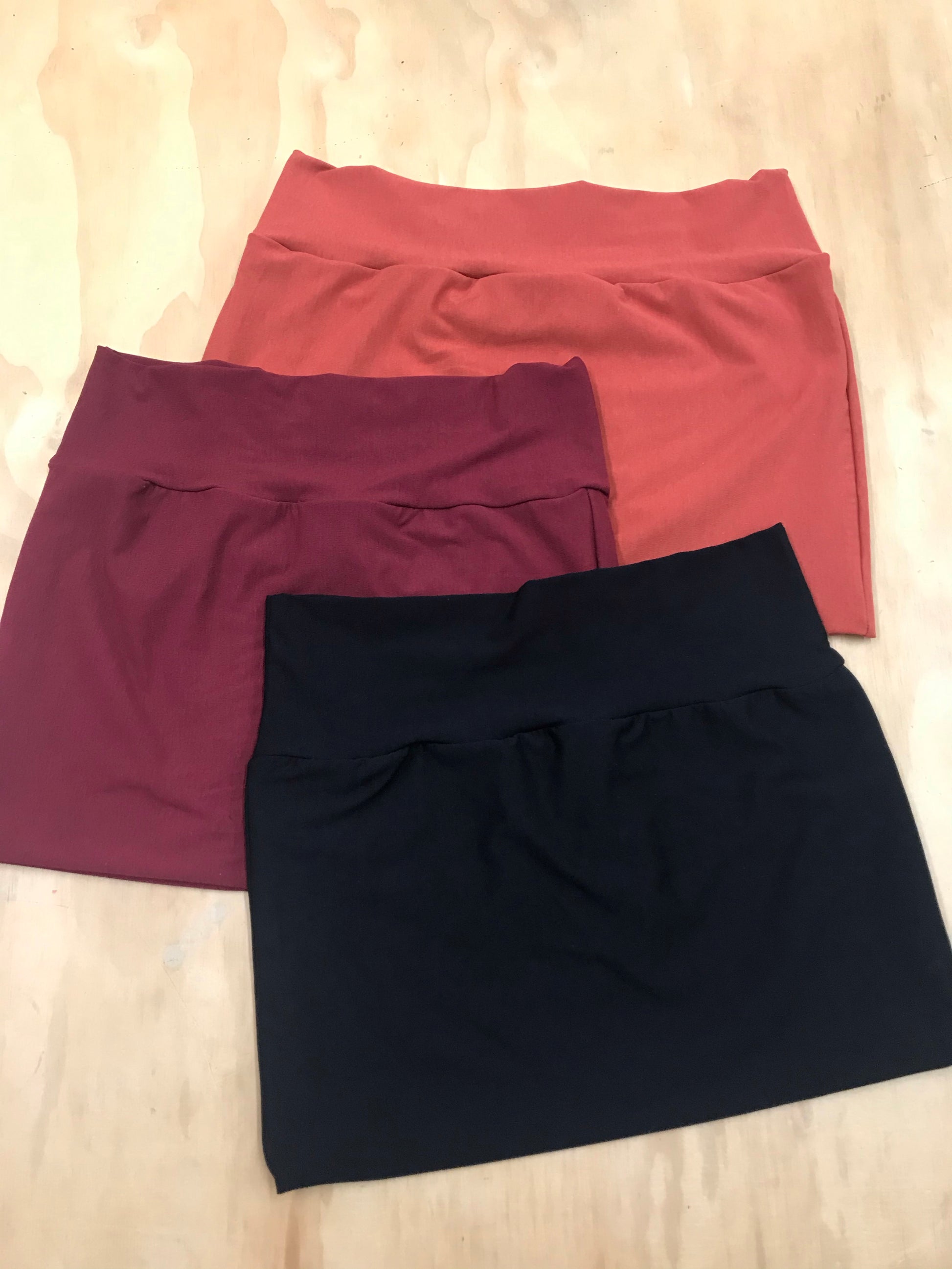 These are great for over leggings and yoga pants. They add flattering coverage that smoothes you out and flatters your tush! Locally made from organic cotton/Lycra jersey.