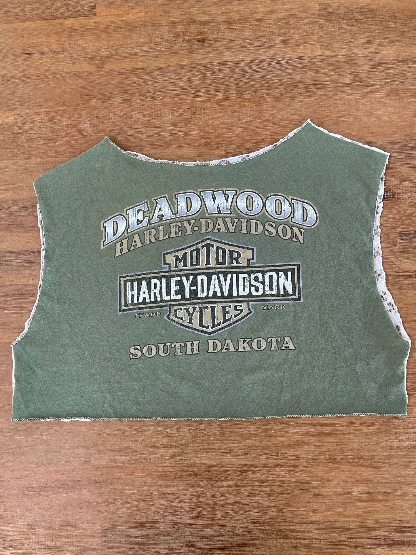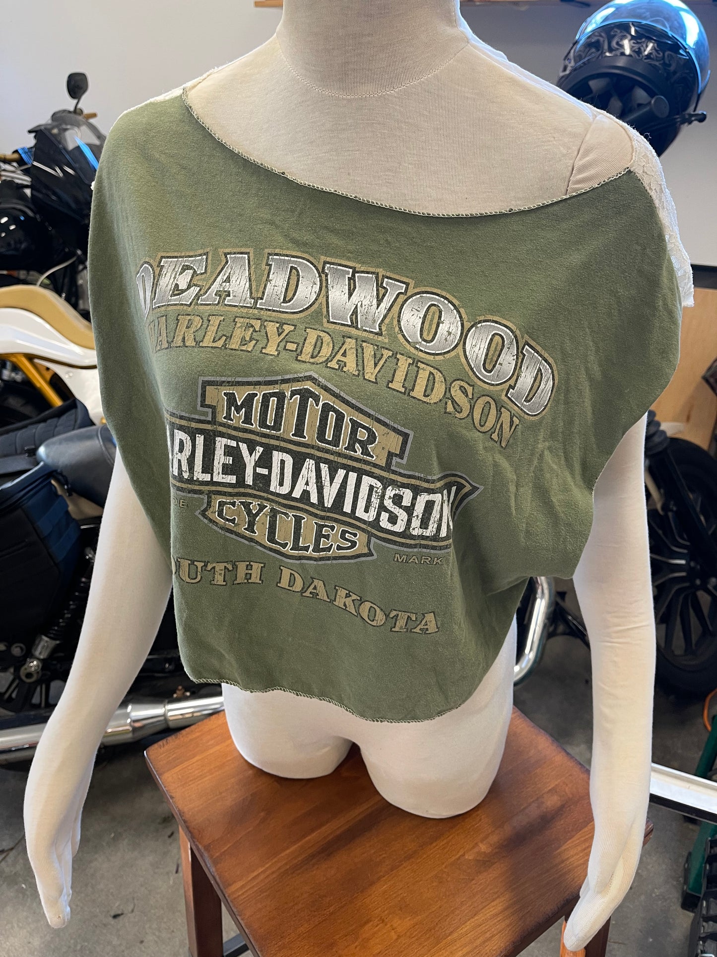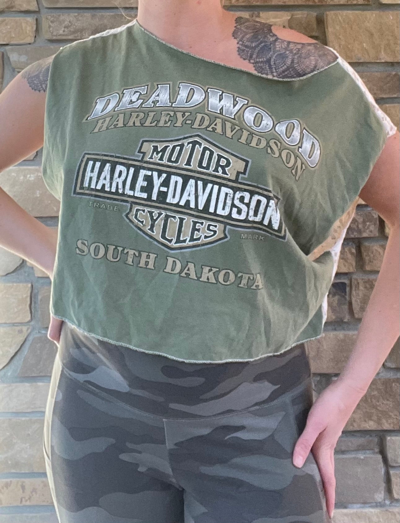 Made from a vintage, 2004, Deadwood Harley Davidson Tee. So soft, comfy and cute. Looks great with jeans, shorts, leggings and riding pants!