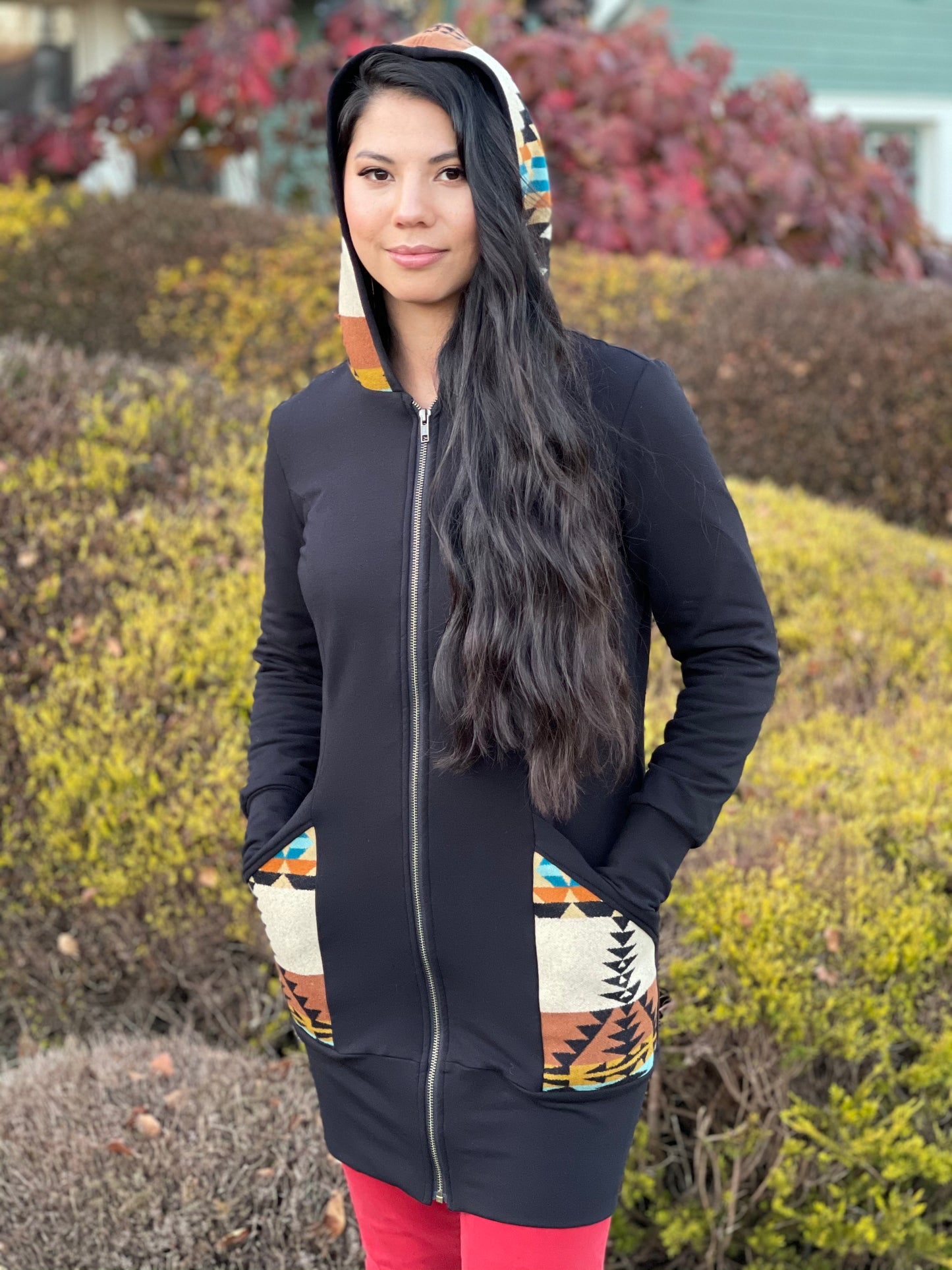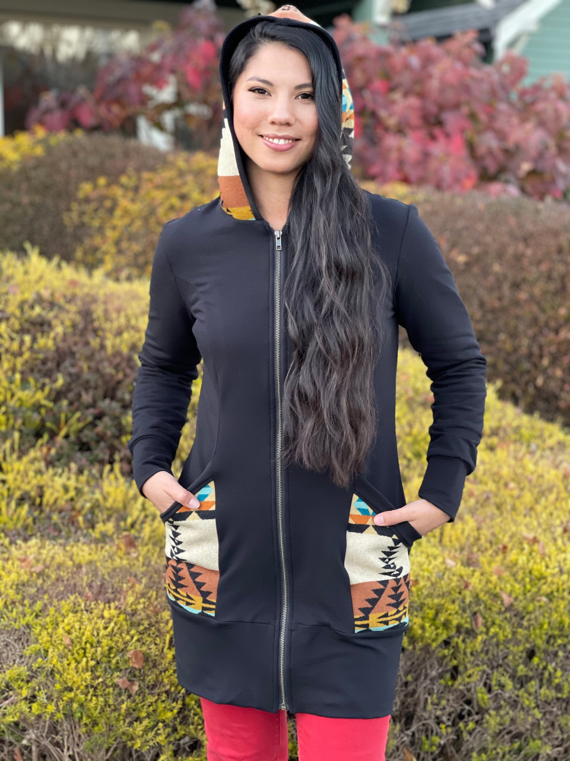 This is my most prized design ever! Handmade here in Humboldt County from thick and stretchy organic cotton french terry and Pendleton Wool, which is woven in Oregon from wool sourced from ranchers in Umatilla County. The Pendleton Mill has been weaving wool in the Portland area for over 130 years. It is an honor to be able to incorporate their weavings into my handmade designs. These jackets feature flattering seams down the front and a locking YKK zipper that won't slip down. Pockets are fully lined and large enough for any phone. Handmade from start to finish, here in Humboldt County, CA with the highest quality materials available.