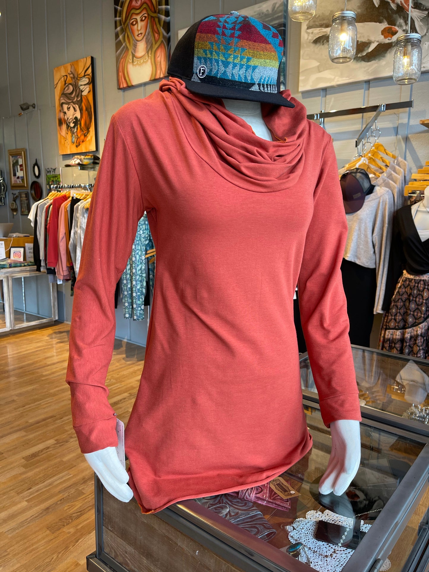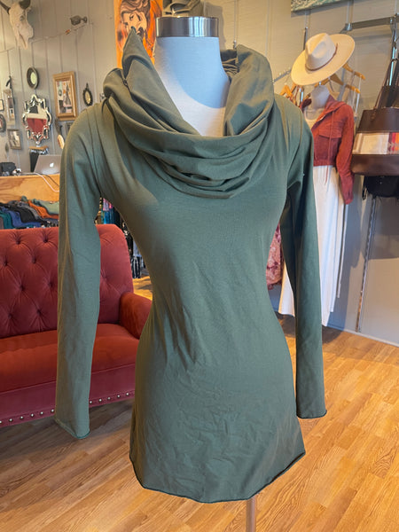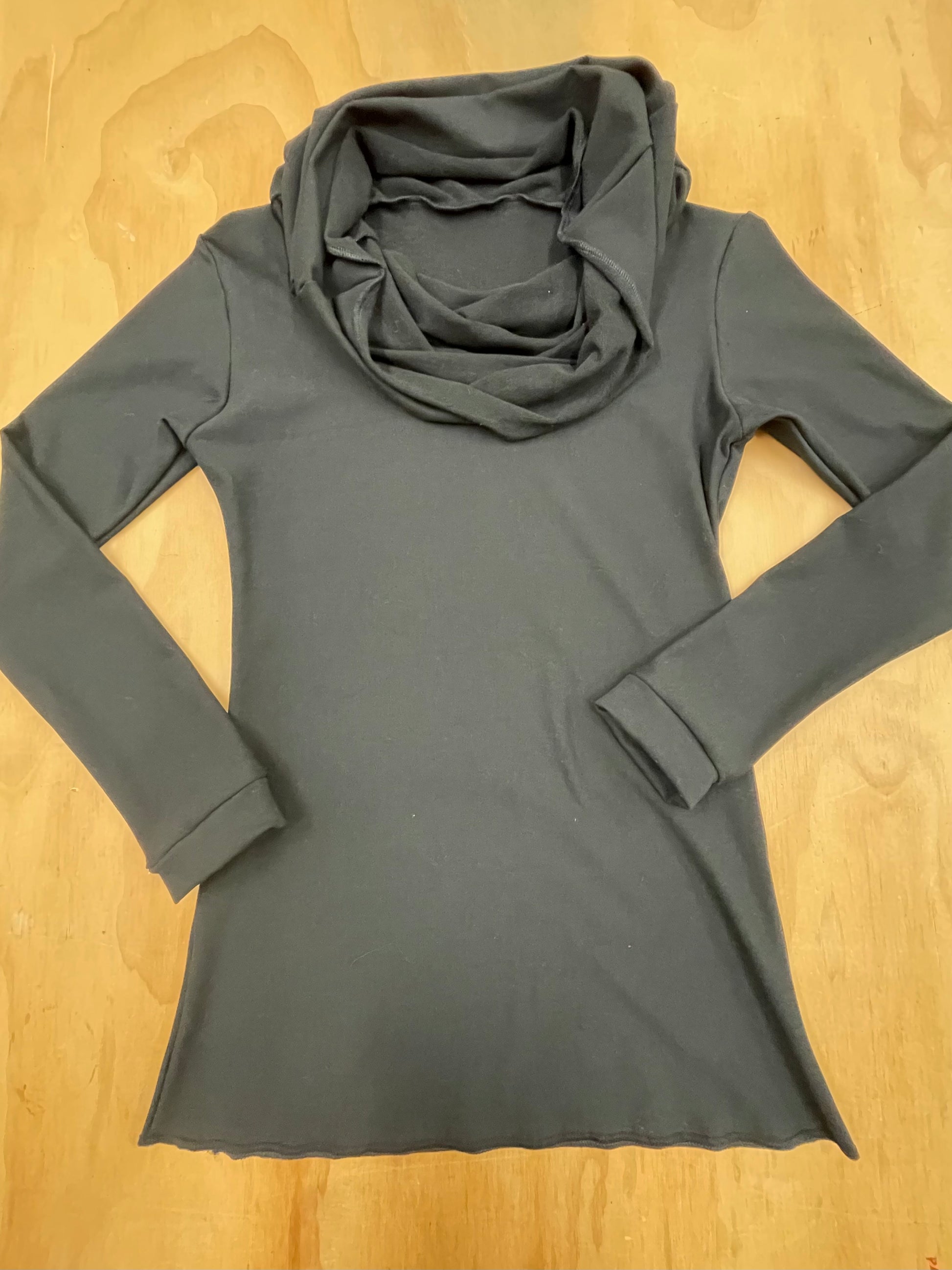 The perfect top for adventuring or lounging. Cowl neck doubles as a big ol hood. Great with leggings. Handmade locally, here in Humboldt County, CA.