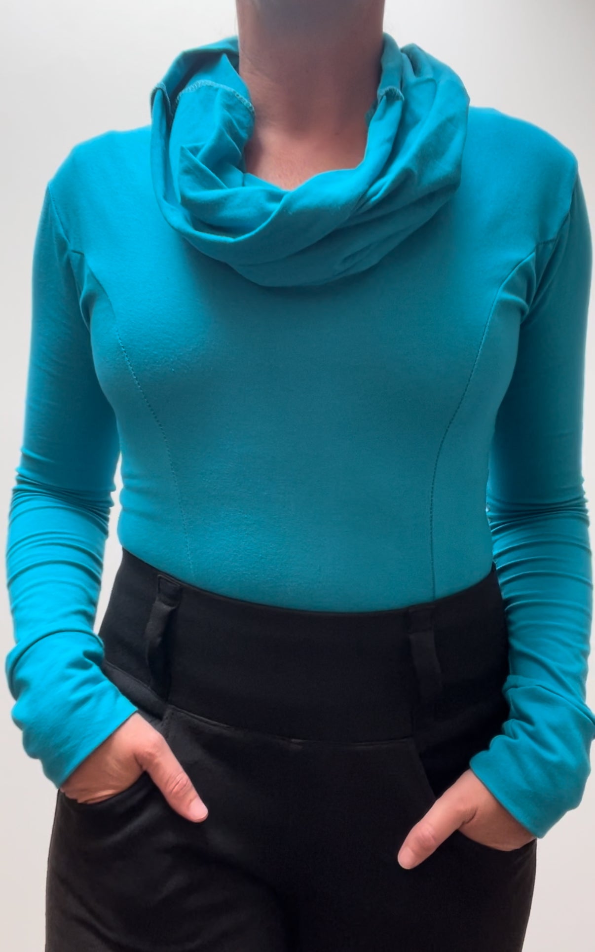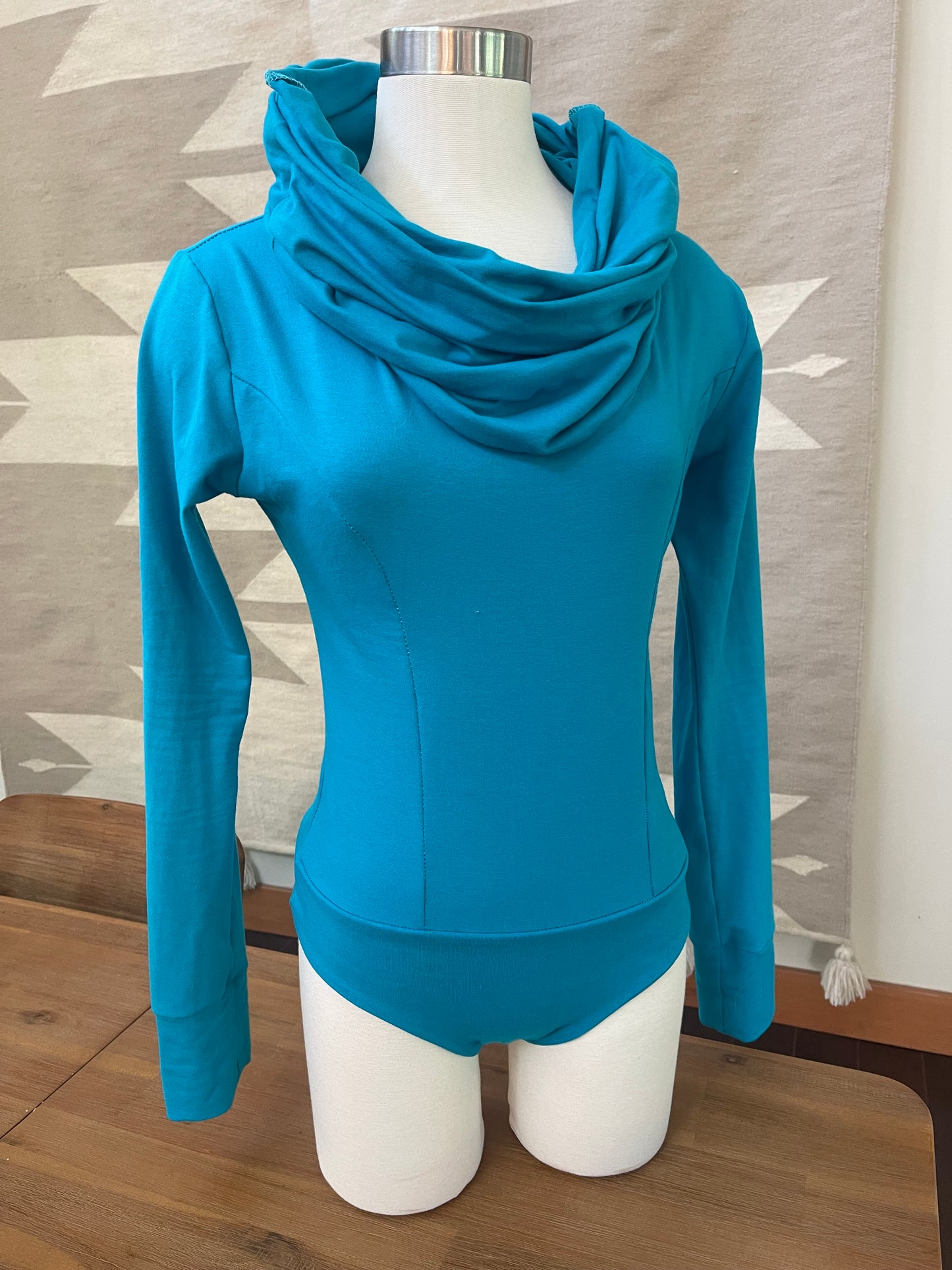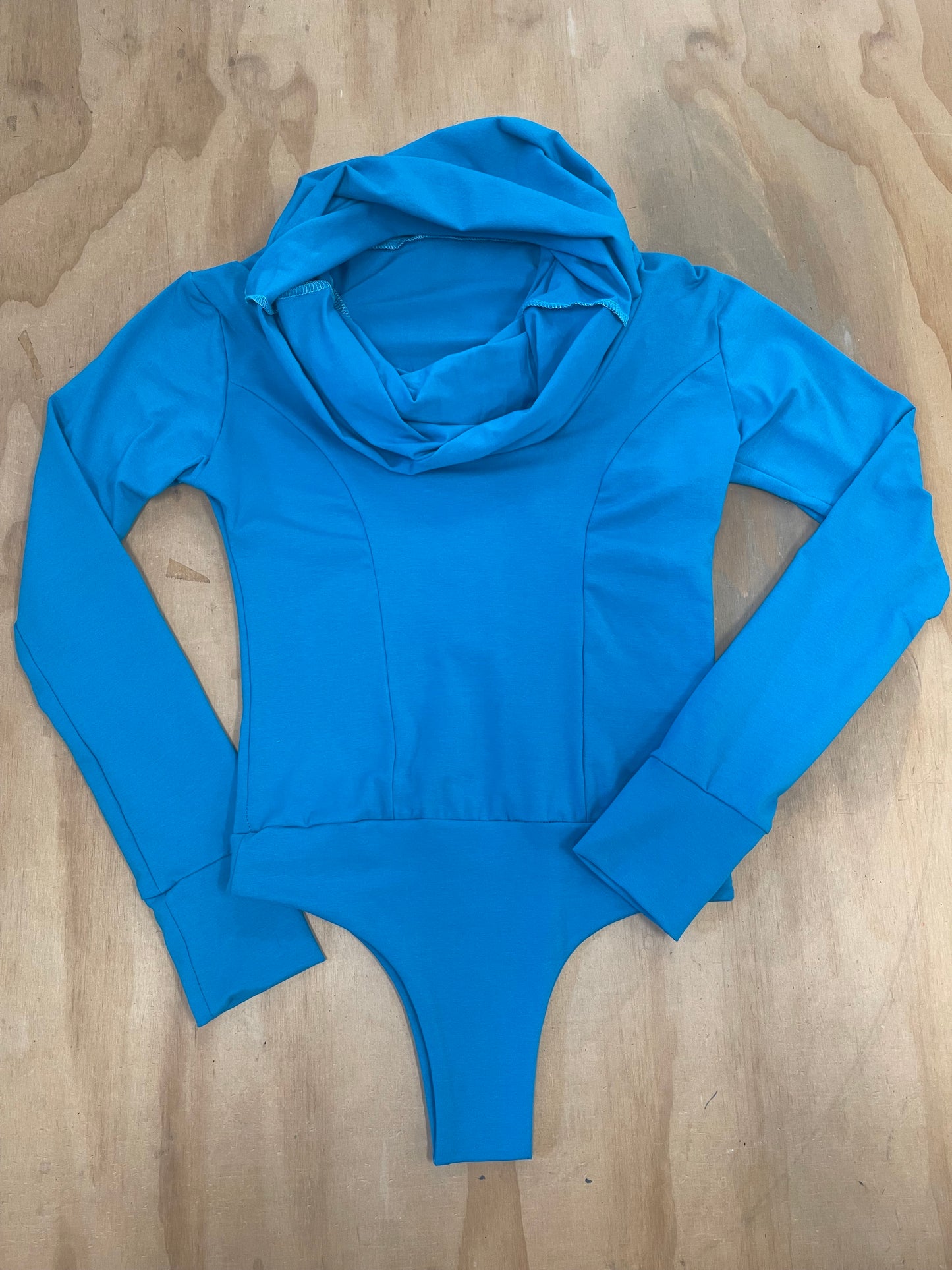 This hooded top is great for active girlies who need something that’s always tucked in, to protect from wind, but also look nice and put together. Features a cozy cowl neck that doubles as a hood. I love it with my moto riding pants, jeans, palazzo pants and long skirts. All my bodysuits are designed so you step into them. The neckline stretches around the hips. To use the restroom, you don’t need to take the whole thing off. Just pull it to the side. Features a cheeky cut that won’t cut off your booty cheeks. This fit actually makes your booty pop!